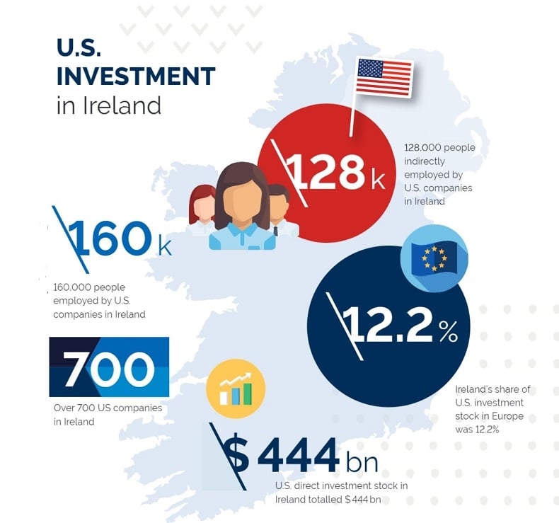 Ireland – “hòn ngọc lục bảo” của Châu Âu được các tập đoàn Mỹ xem như cánh cửa lớn để vào thị trường Châu Âu và quốc tế. Năm 2016, quốc gia này hấp dẫn đến 12.2% tổng đầu FDI của Mỹ vào Châu Âu. Hơn 700 công ty Mỹ ở Ireland tạo ra công ăn việc làm cho 128.000 người lao động ở quốc gia này.